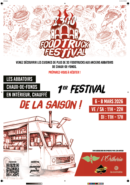 Au cœur de La Chaux-de-Fonds, le 2300 Food Truck Festival vous invite à vivre une expérience unique mêlant cuisine du monde, convivialité et esprit festif. Ici, les food trucks venus d’horizons différents se rassemblent pour vous faire découvrir leurs spécialités, leurs passions et leurs histoires, dans une ambiance chaleureuse et accessible à tous.